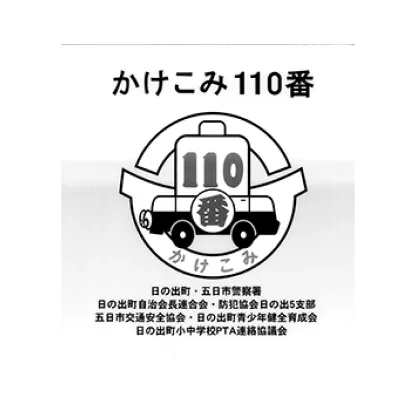 日の出町のマークとパトカー及びかけこみ110番を合わせたデザインです。