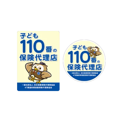 日本損害保険代理業協会のキャラクター『森の賢者“ふうた”』をデザインしたステッカー「子ども110番の保険代理店」を、代理業協会会員の事務所等に掲示しています。会員の「子ども110番の家」の登録・活動をサポートしています。